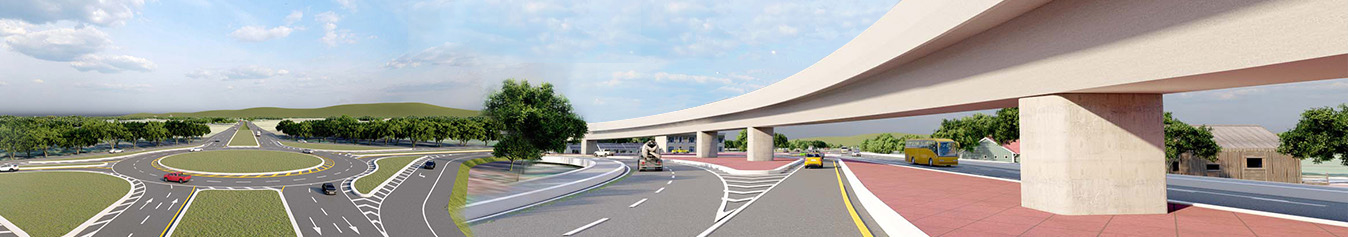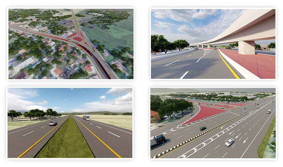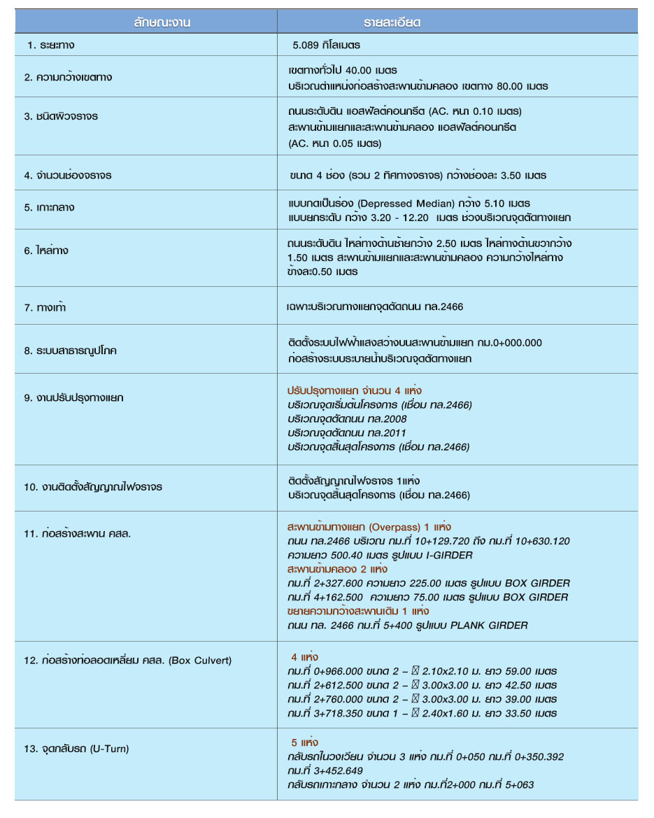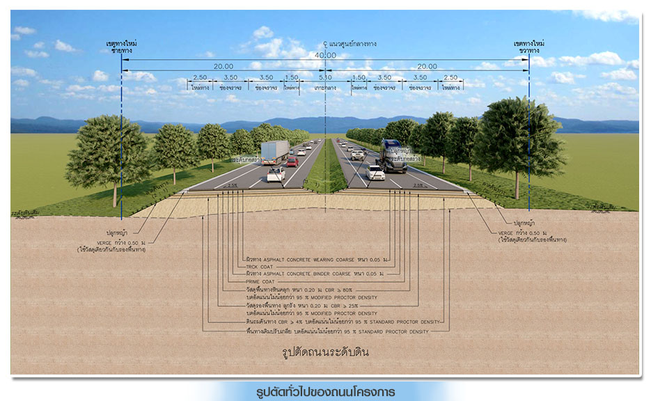 (1) งานก่อสร้างถนนระดับดินผิวจราจรแอสฟัลติกคอนกรีต ขนาด 4 ช่องจราจร ไป-กลับ ทิศทางละ 2 ช่องจราจร ความกว้างช่องจราจรละ 3.50 เมตร ความกว้างไหล่ทางด้านซ้าย 2.50 เมตรและด้านขวากว้าง 1.50 เมตร แบ่งทิศทางจราจรด้วยเกาะกลางถนนแบบกดเป็นร่อง กว้าง 5.10 เมตร